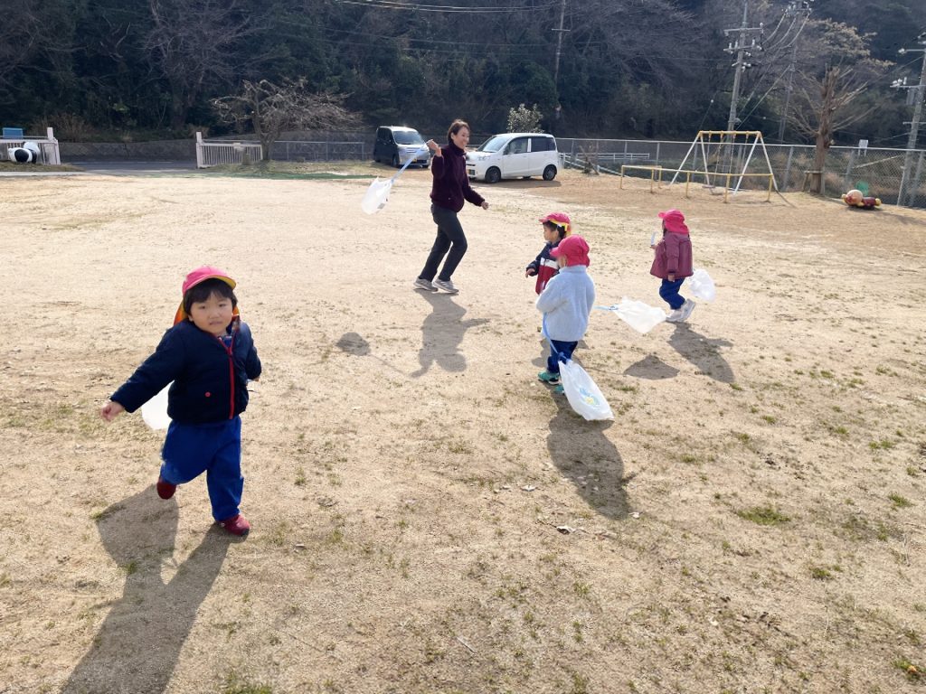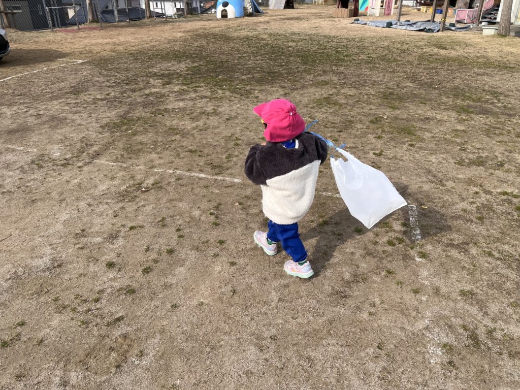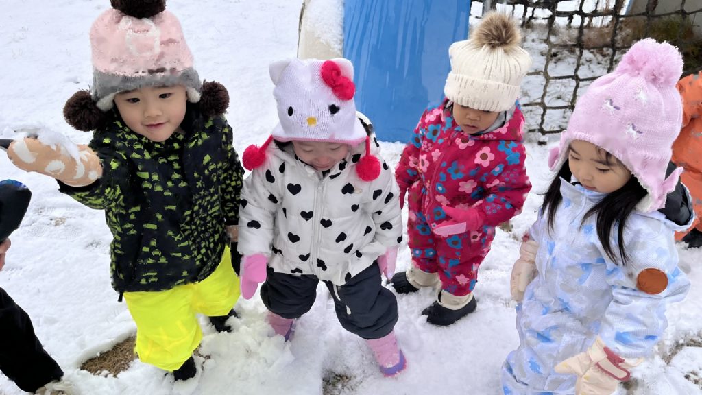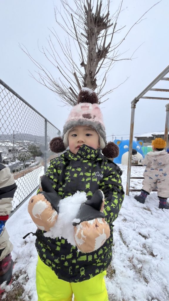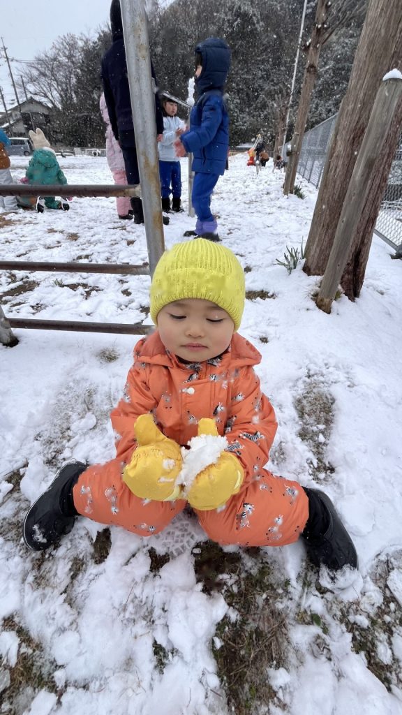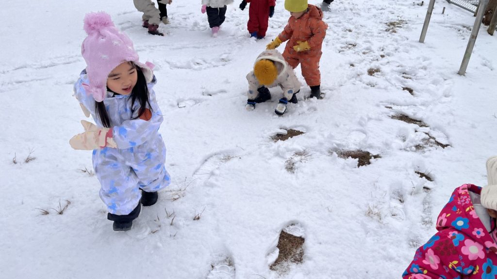今日は、園庭に雪が積もっていて、みんなで雪遊びを楽しみました。朝から雪が降っていることを喜んだり、雪遊びできるかな・・・と楽しみにしたりする姿がたくさん見られたたんぽぽ組さん!雪遊びの服も自分で袋から出して、先生や友達と一緒に着替えることも楽しみにしていた様子でした。雪の中に足を入れるとふわふわだったようで、「雲みたいだね!」「ふわふわしてる!」と大興奮の子ども達でした!手袋をはめて雪を触り、みんなで雪合戦したり、雪だるまをつくったりと笑顔いっぱいで楽しんでいました♪