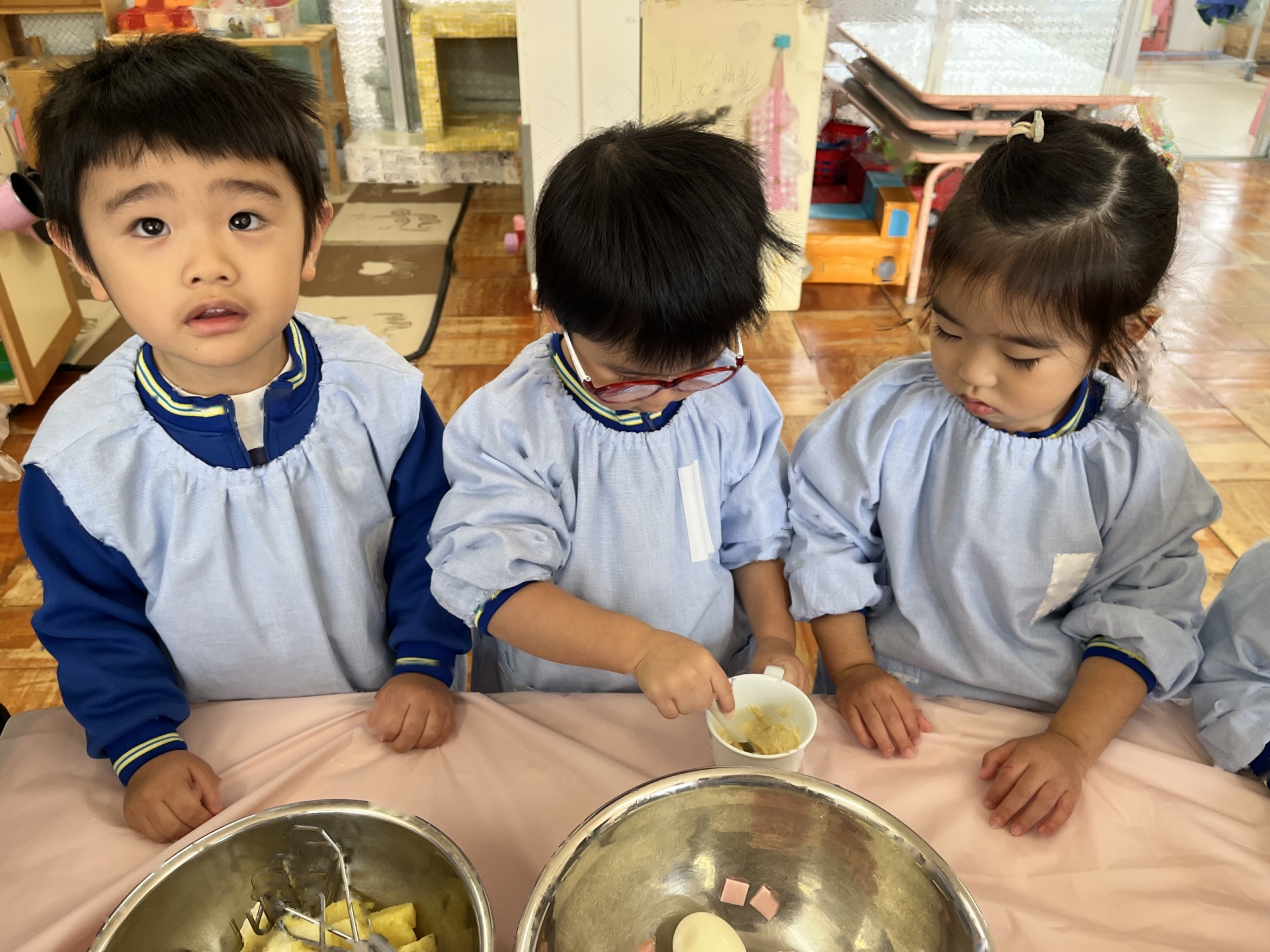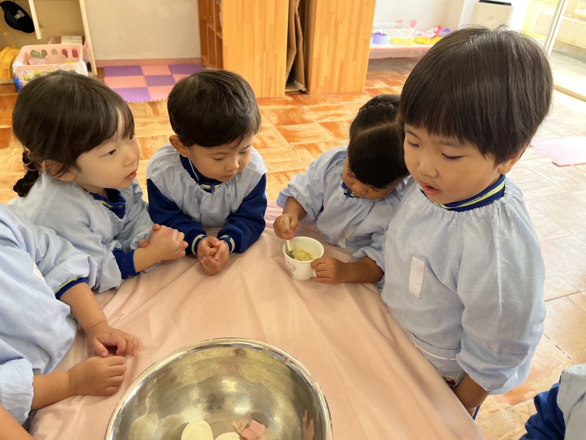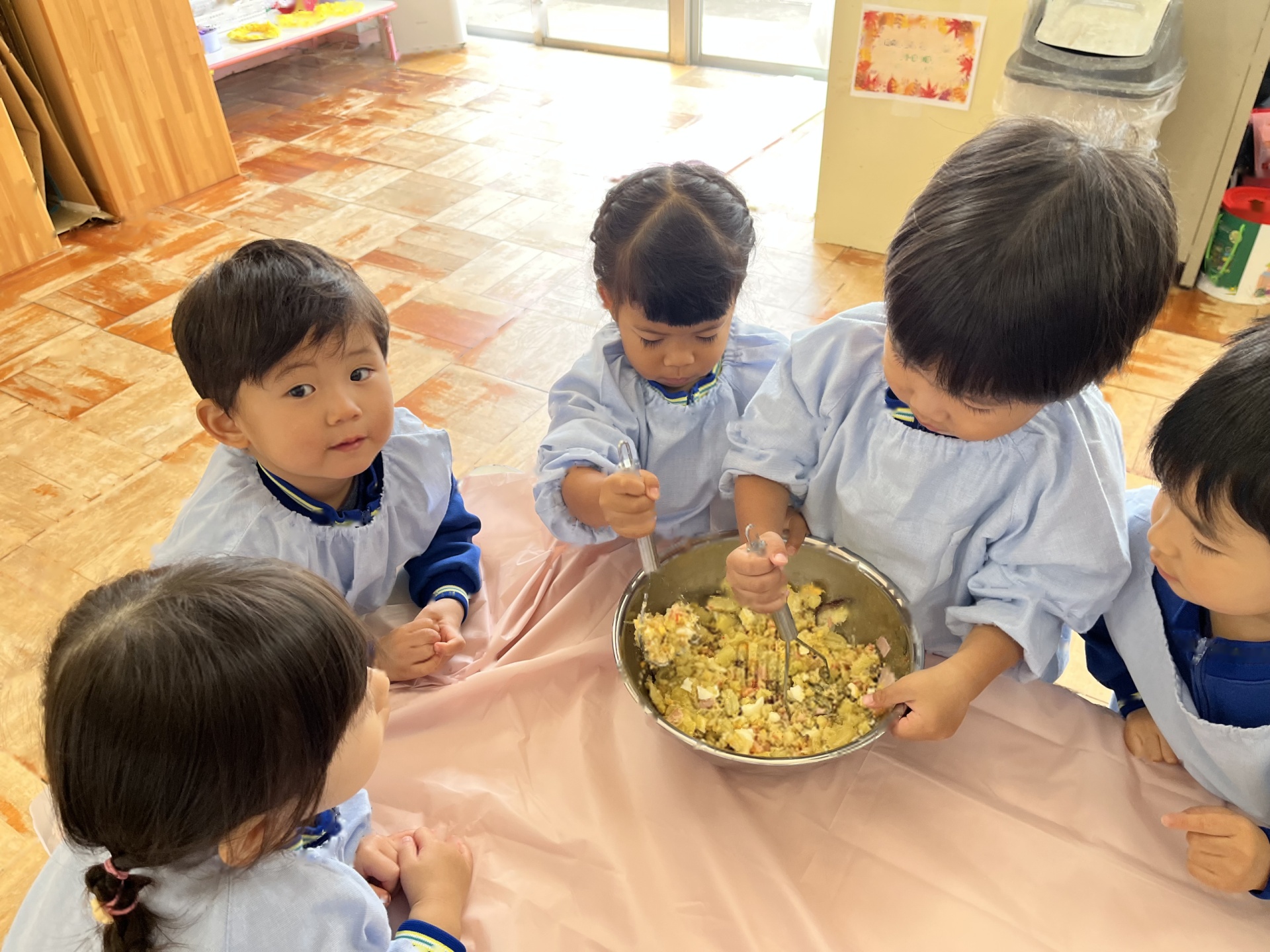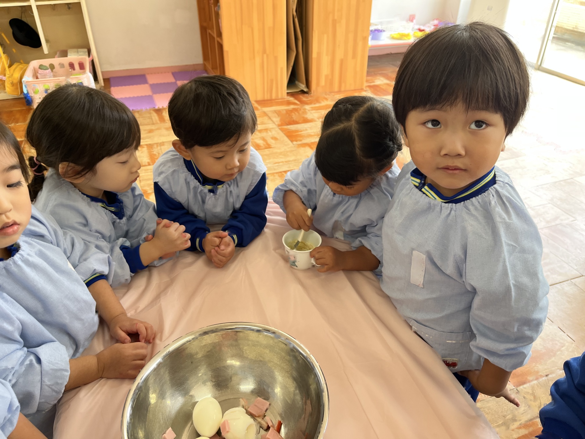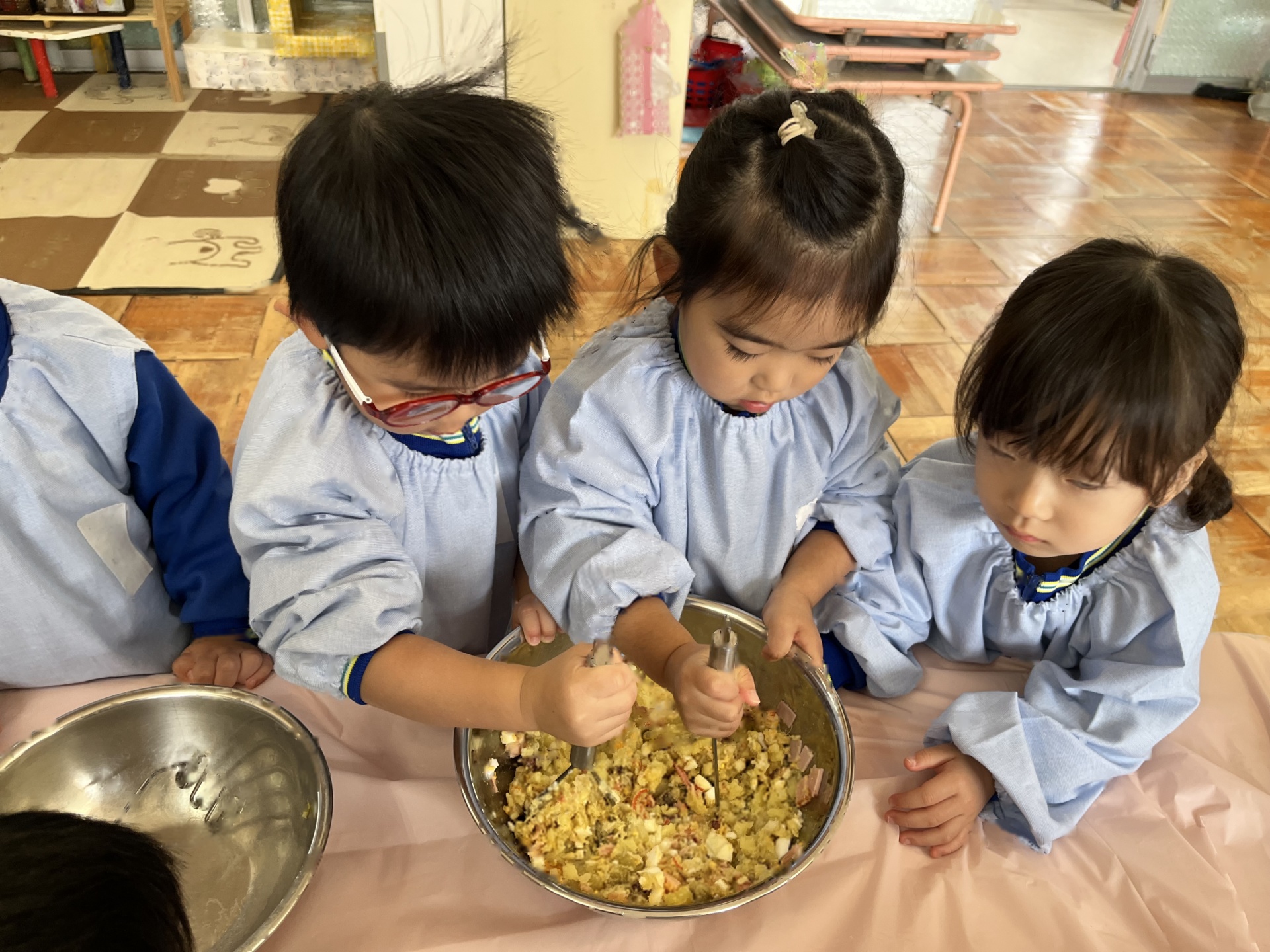 2回目のクッキングは、お芋のサラダを作りました!「みんなで作ると美味しい!」と笑顔いっぱいのたんぽぽ組さんでした!コンソメとマヨネーズを混ぜてソースを作ったり、芋と卵を混ぜたり、完成し、みんなでおいしくいただきました!!!