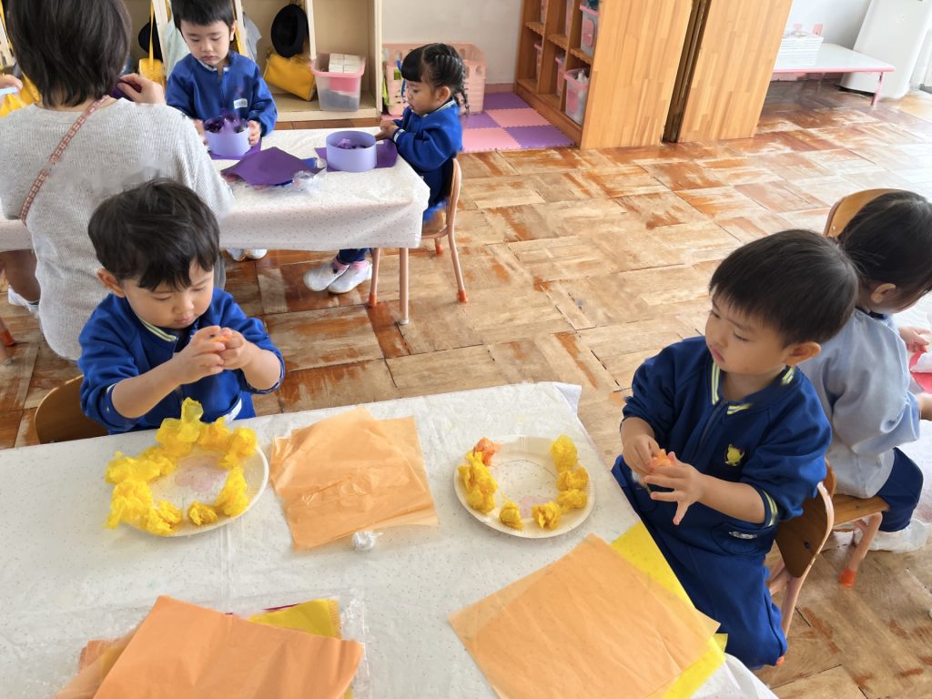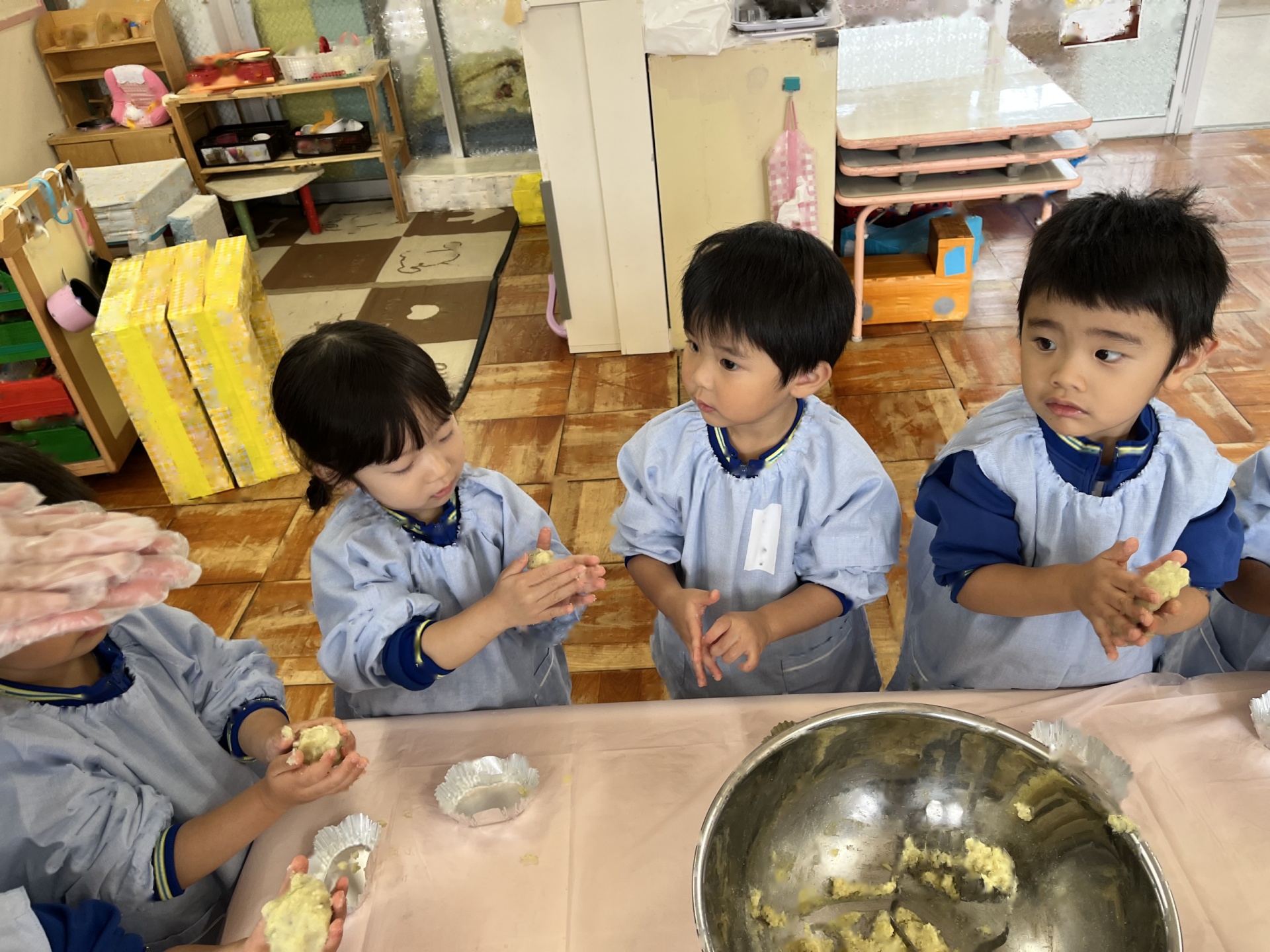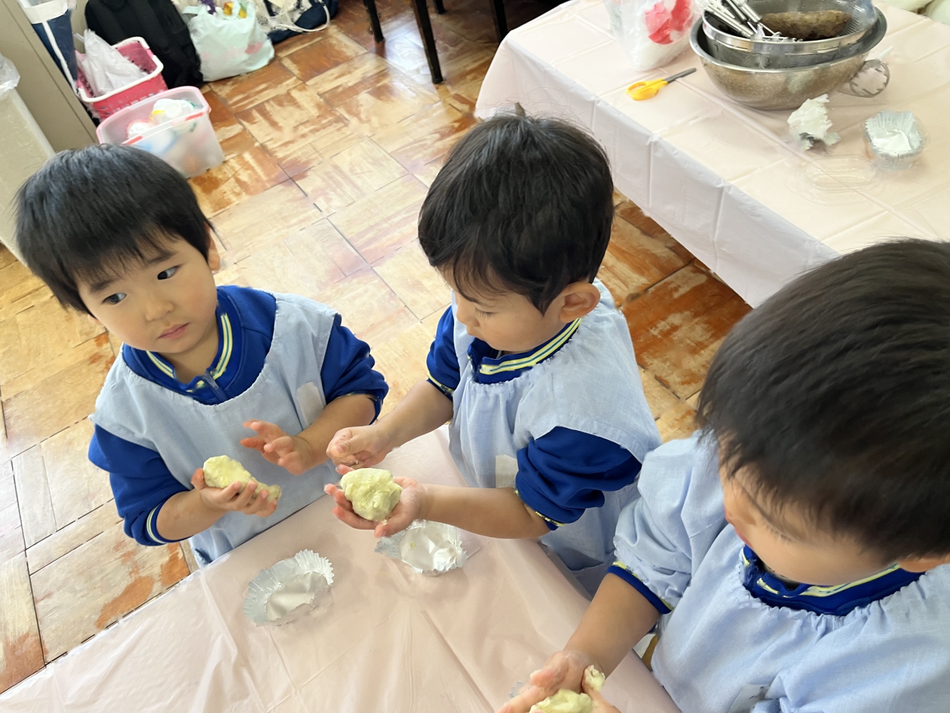 さらに小さく丸める所をばら組のお友達と一緒に楽しんだたんぽぽ組さん。丸めることが難しい姿もありましたが、「手伝ってあげる!」とばら組のお兄さん・お姉さんに優しく手伝ってもらったり、「こうだよ!」「手のひらでクルクルってするんだよ!」と優しく教えてもらったり、一緒に作ることができて笑顔いっぱいの子ども達でした♪!!異年齢での交流もクッキングを通してしっかりとでき、大満足のたんぽぽ組さんでした!!!