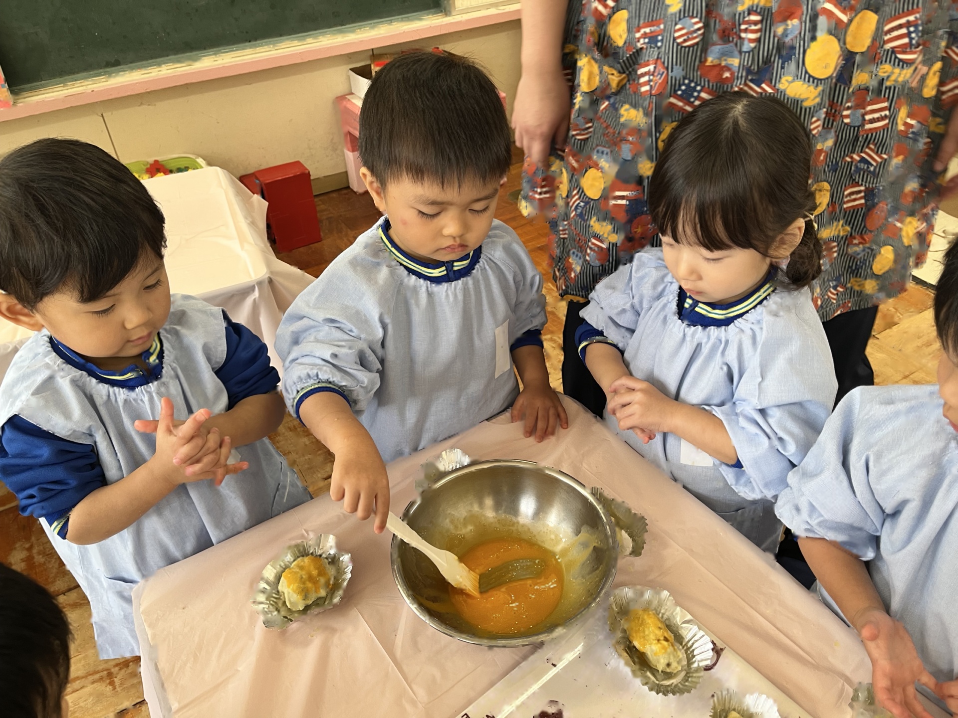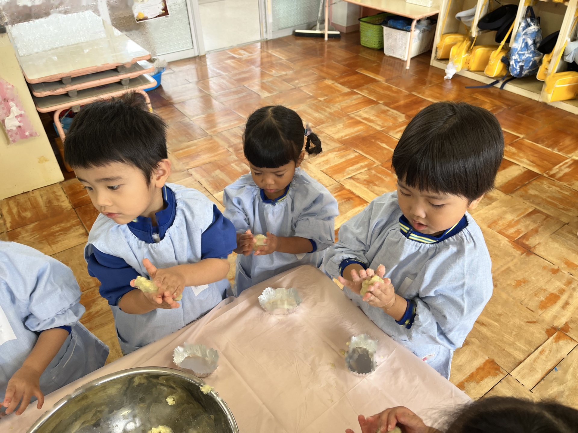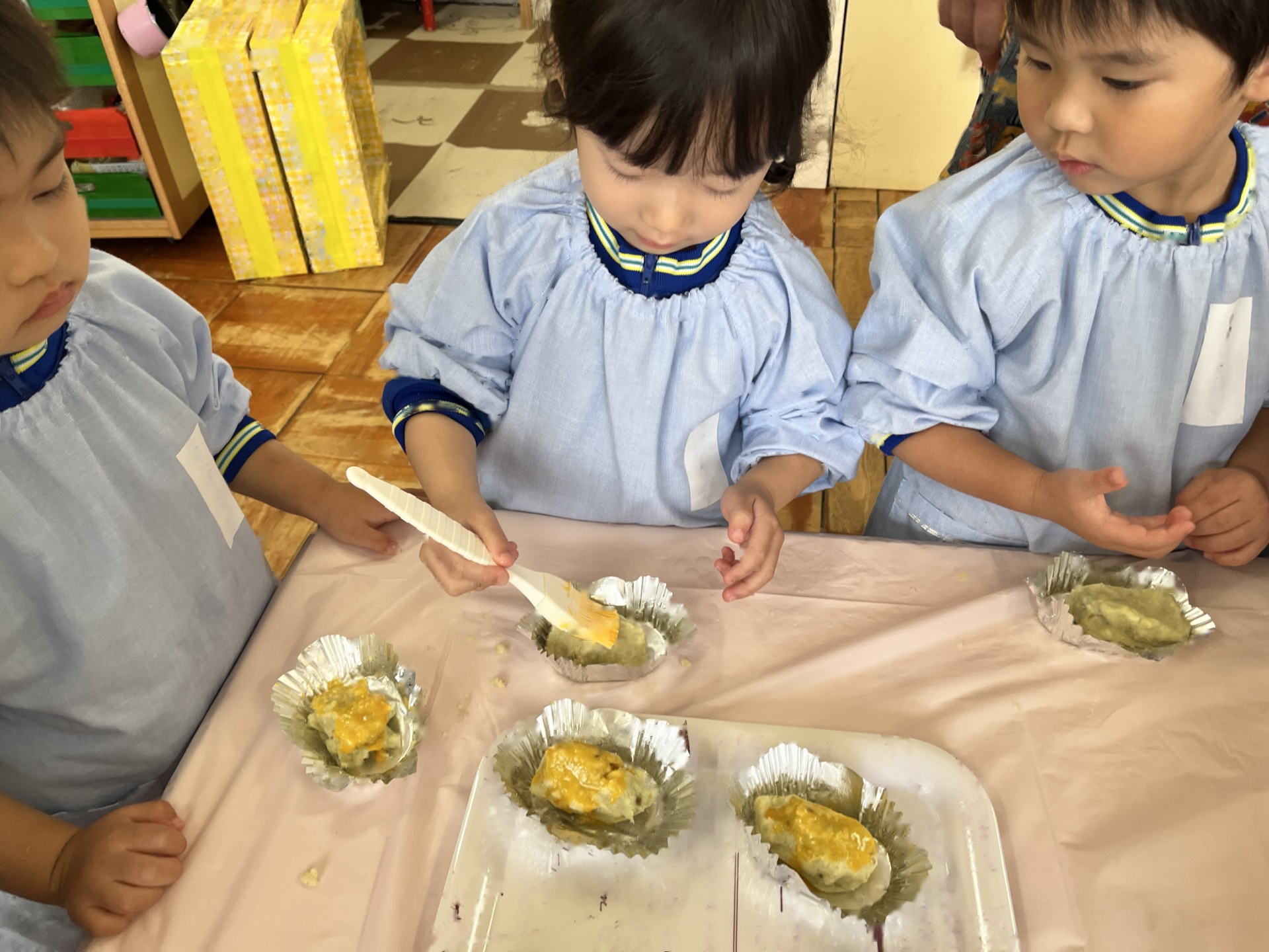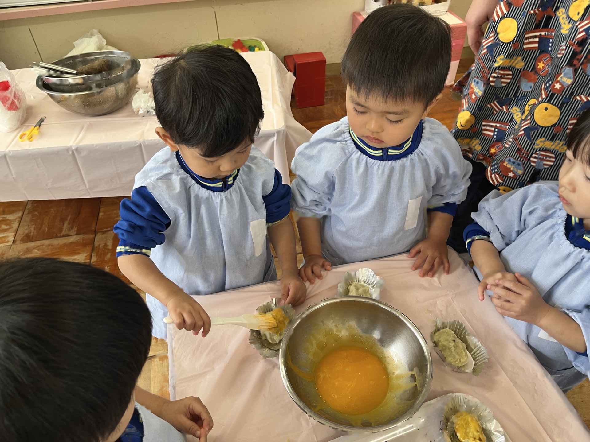 みんなで混ぜた後は、くるくる丸めて形を作って卵をぬりました!!