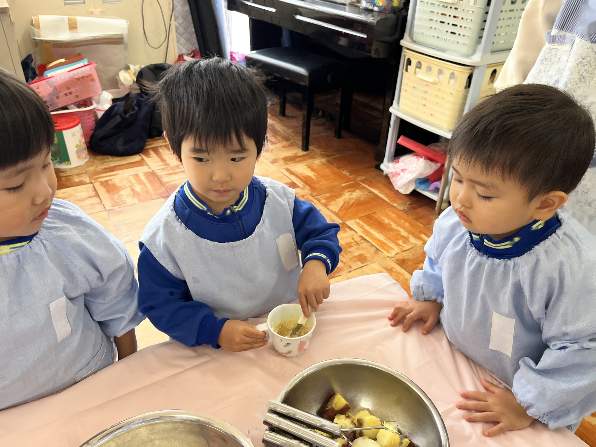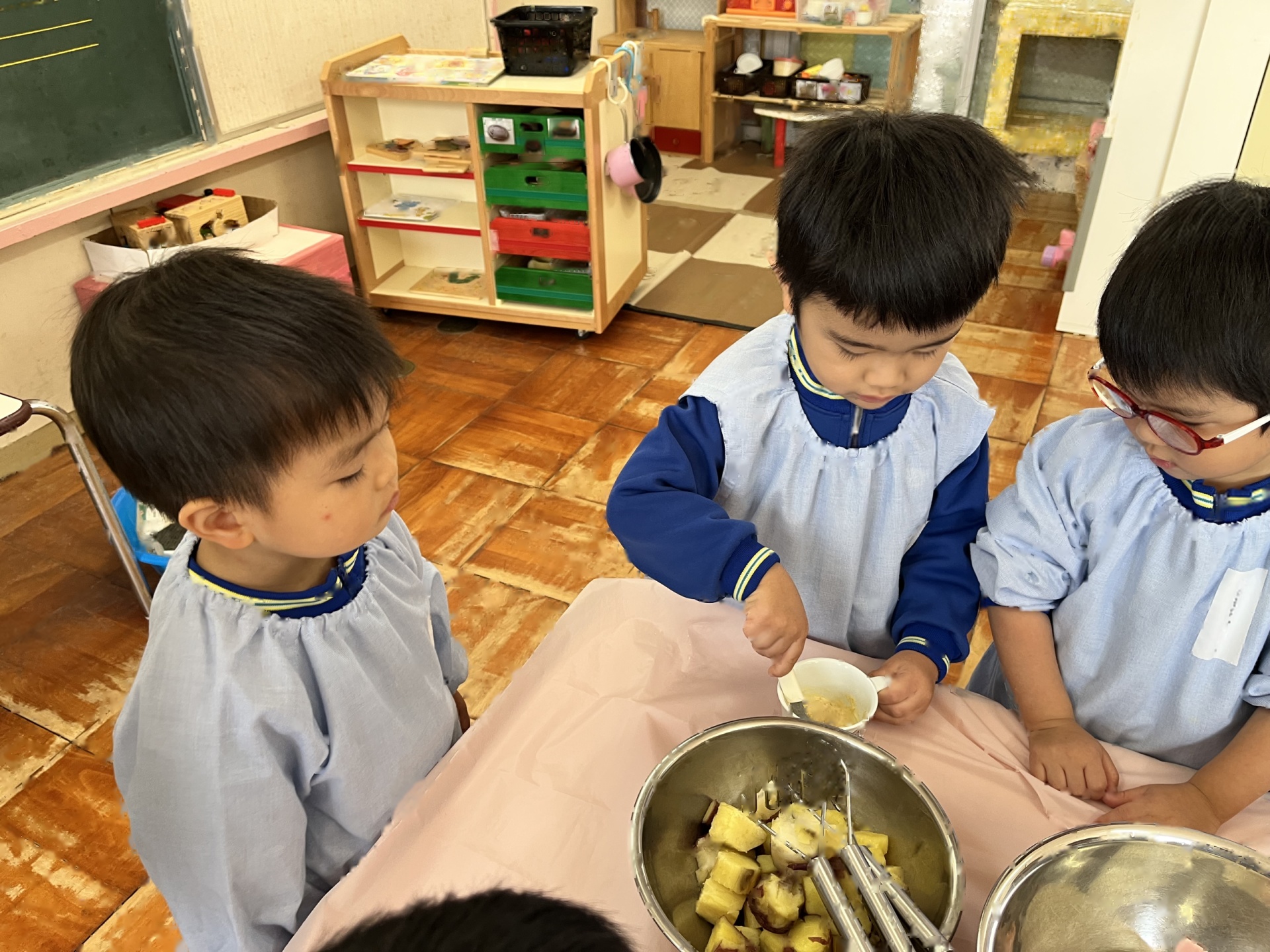 たんぽぽ組のみんなで掘ったお芋を使って、クッキング楽しみました。「芋のクッキング、何作る?」と聞くと、「お芋のお菓子!」「お芋のお汁!」「焼き芋がいい!」などいろいろな思いが言葉で出てきた子ども達です。イラストで出した中からみんなが「これがいい!」と選んだのが、スイートポテトでした!ニコニコでスイートポテト作りに挑戦しました!!