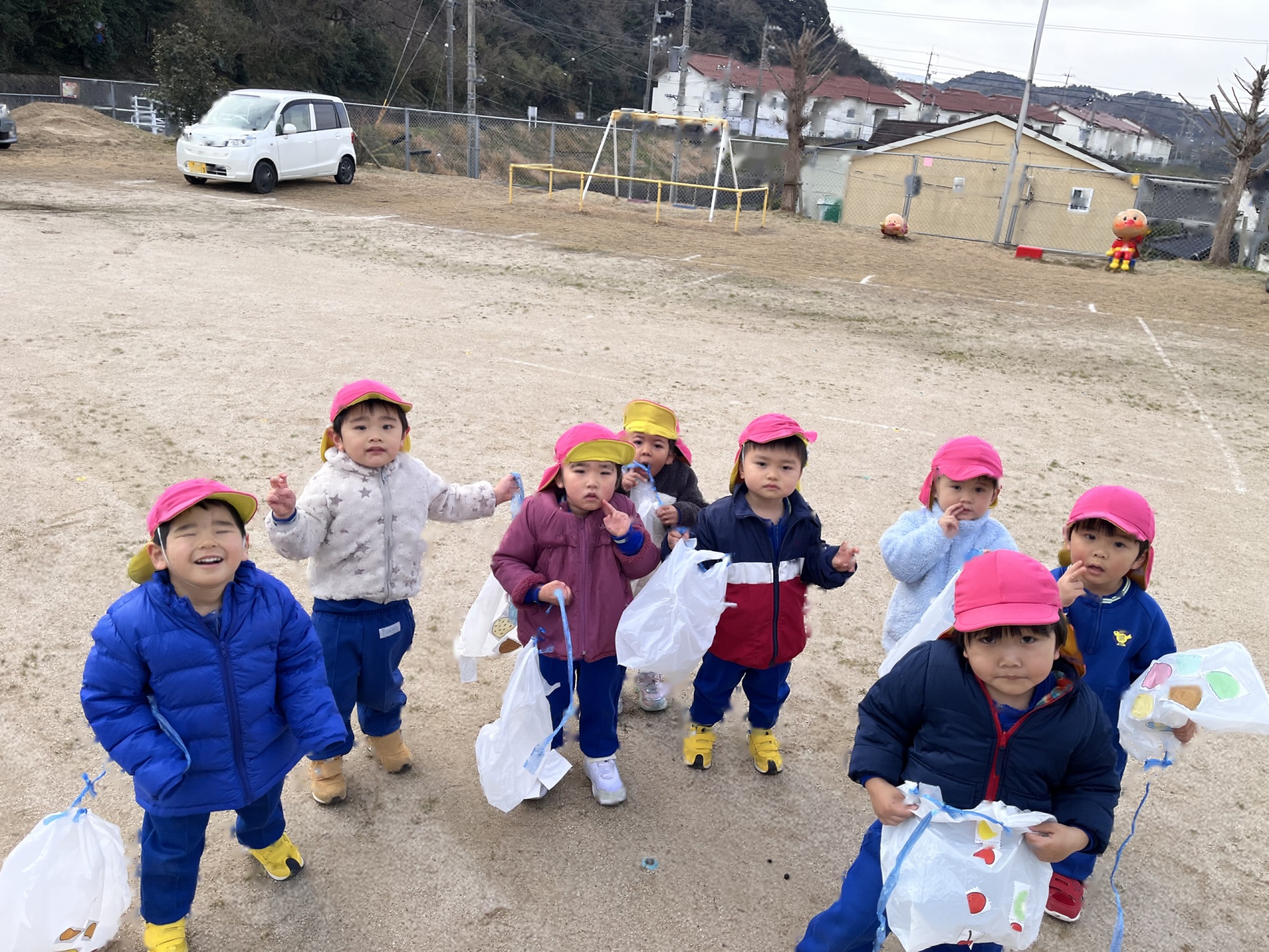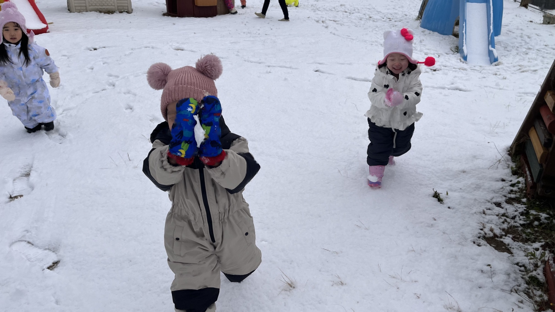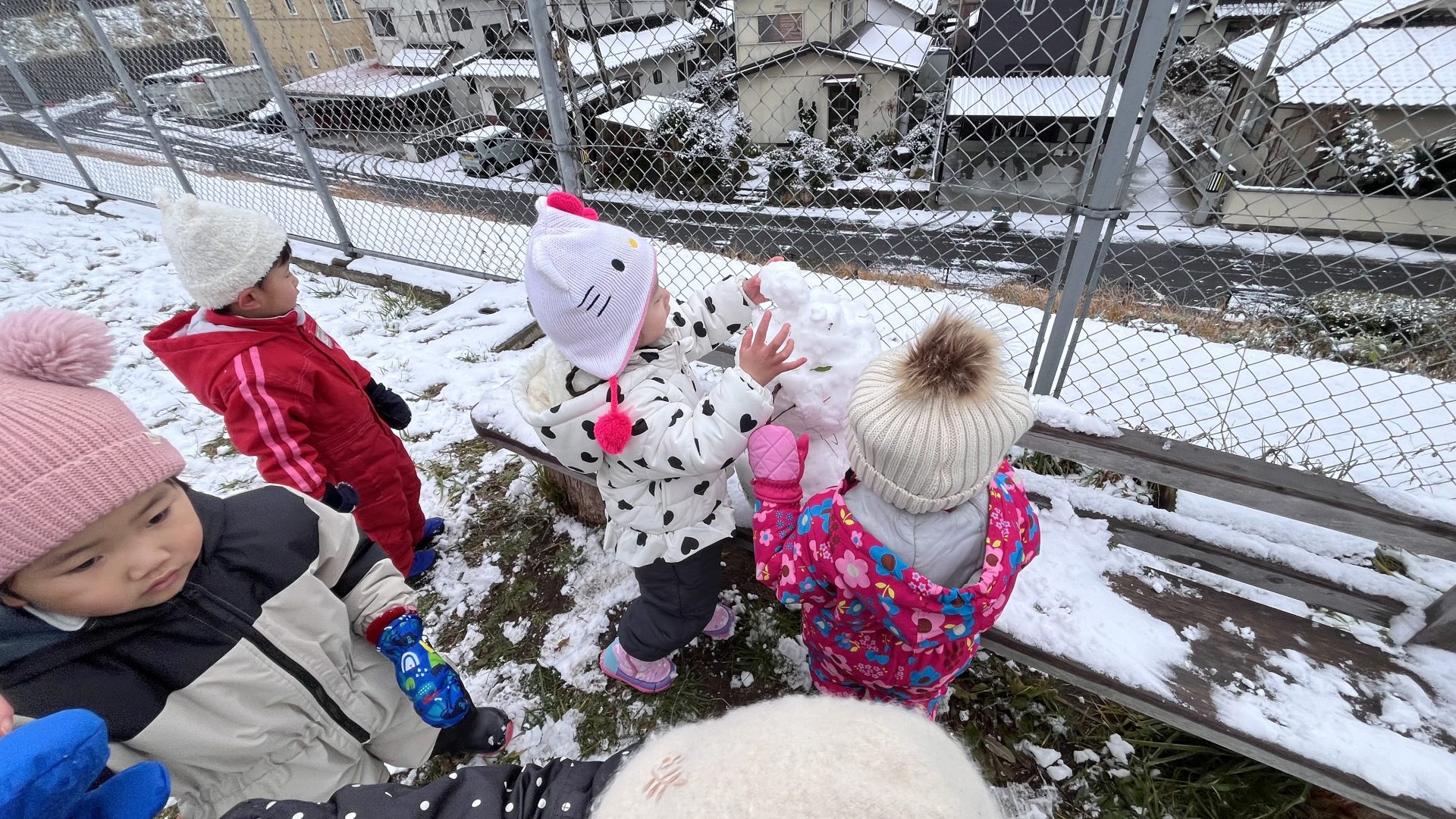 今日は、園庭に雪が積もっていて、みんなで雪遊びを楽しみました。朝から雪が降っていることを喜んだり、雪遊びできるかな・・・と楽しみにしたりする姿がたくさん見られたたんぽぽ組さん!雪遊びの服も自分で袋から出して、先生や友達と一緒に着替えることも楽しみにしていた様子でした。雪の中に足を入れるとふわふわだったようで、「雲みたいだね!」「ふわふわしてる!」と大興奮の子ども達でした!手袋をはめて雪を触り、みんなで雪合戦したり、雪だるまをつくったりと笑顔いっぱいで楽しんでいました♪